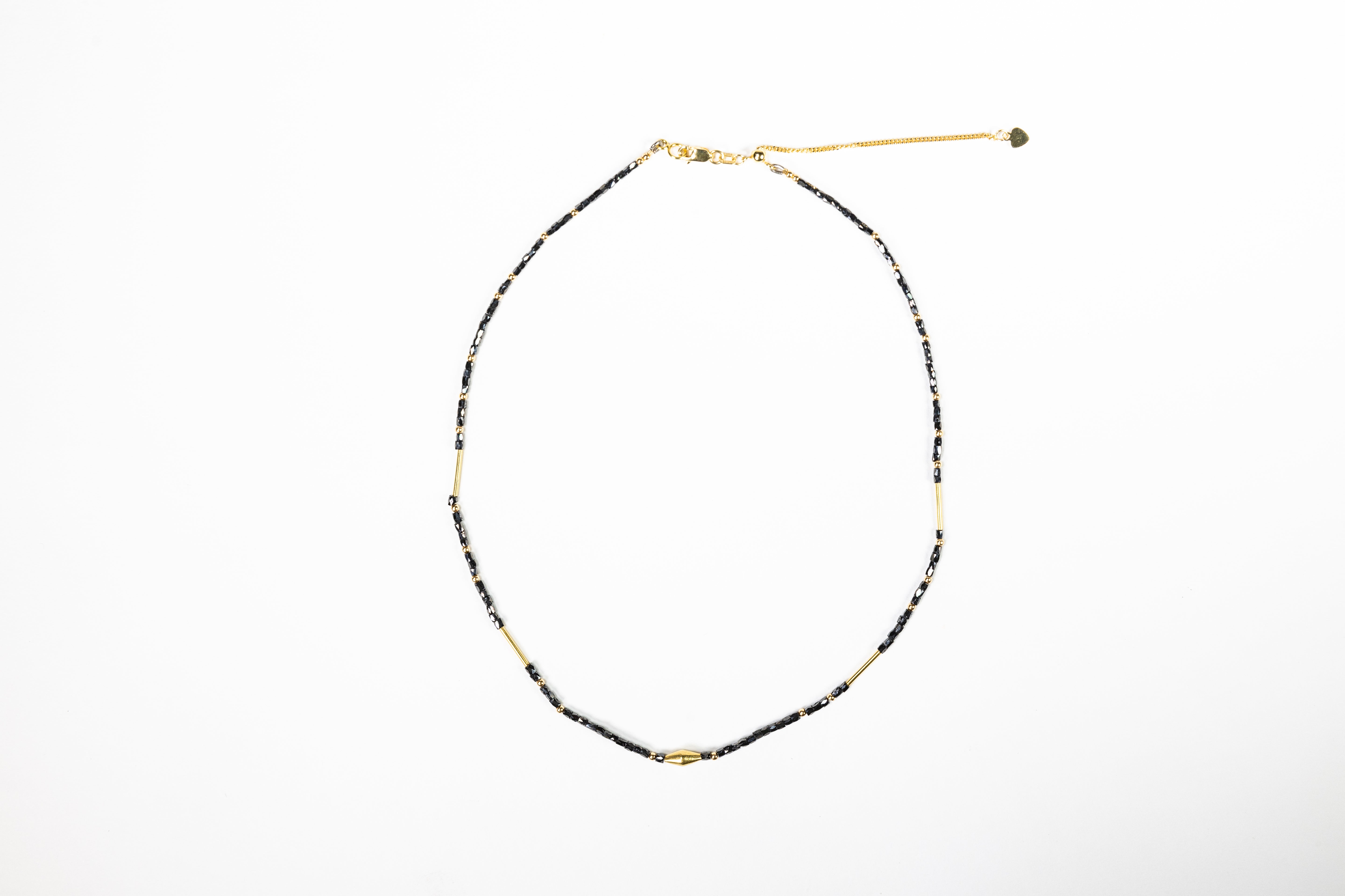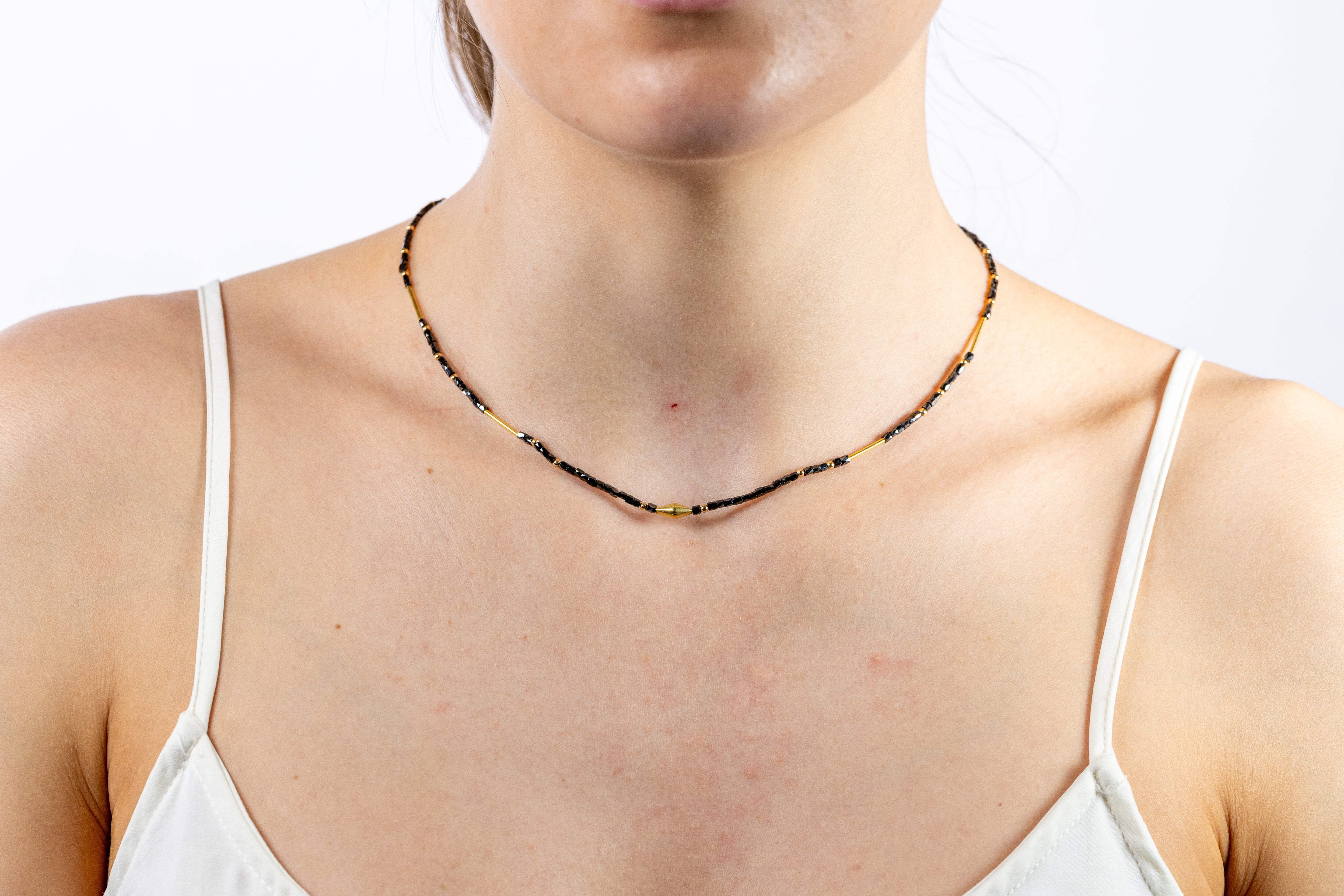 This Black Diamonds Shorty Necklace features exquisite Black Cube Diamonds and 18K gold, creating an elegant and sophisticated accessory. The sliding chain extender allows for a personalized fit, up to 18 inches making it a perfect addition to any outfit. Upgrade your style with this luxurious necklace.
